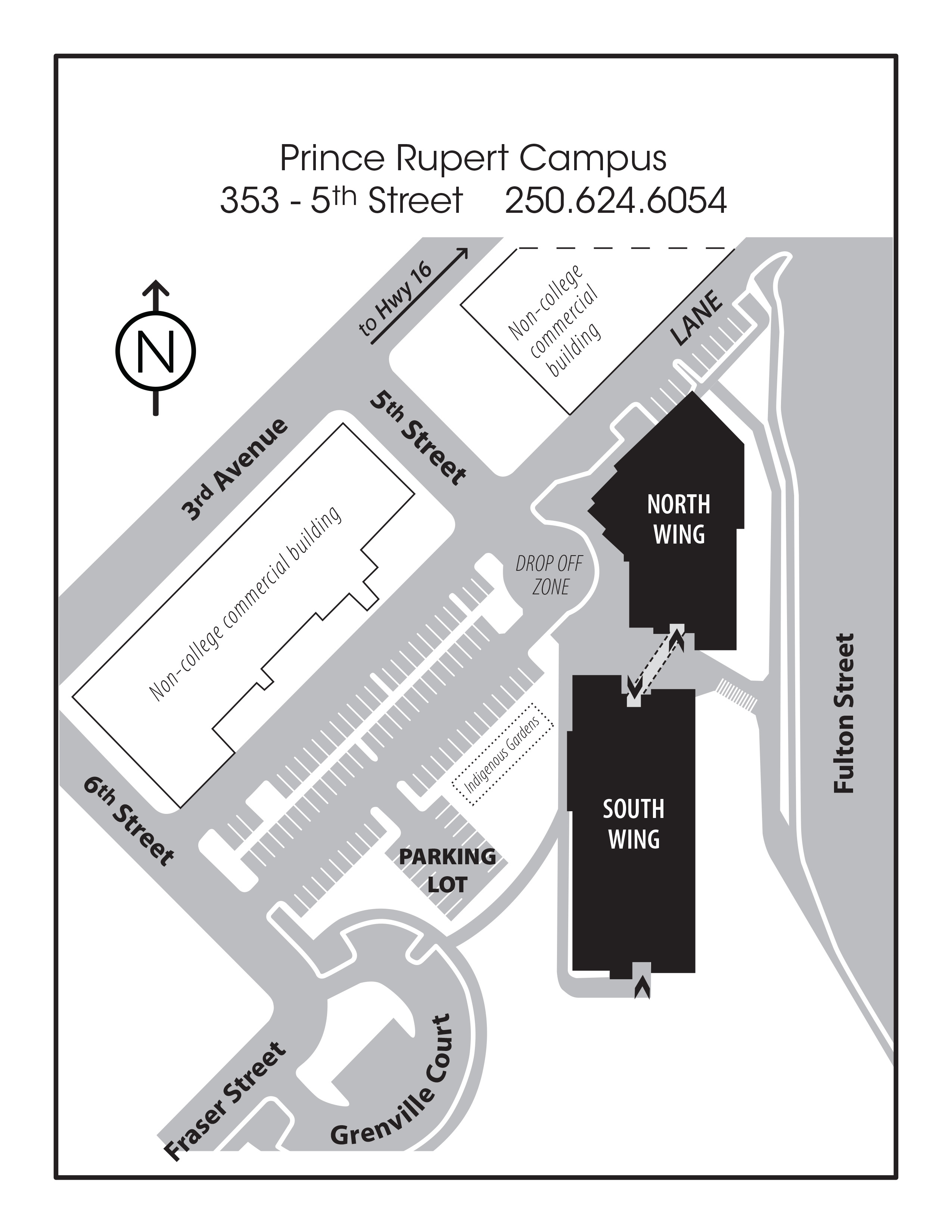 Located downtown Prince Rupert at 353-5th Street, our 12 million dollar campus is designed as two buildings with an interconnecting link and consists of 19 classrooms, two computer labs, two science labs and the innovation lab.