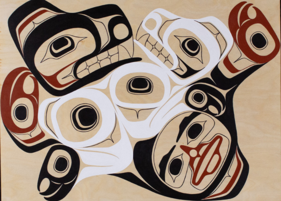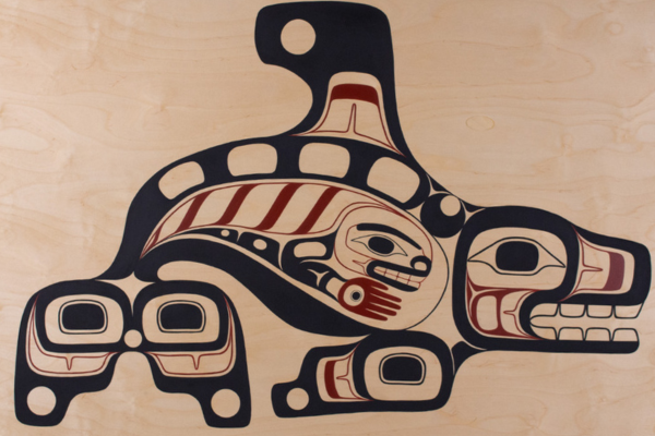 "Luu-dam̓ihl Smax (Bear Hug)" by Erica Davis (Nisga'a). 22" x 28" acrylic on birch.