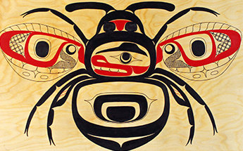 This year’s first place $2,500 award goes to first-year student, Alexander Erickson (Nak'azdli and Haisla) for his acrylic painting on birch panel called The Provider, featuring his interpretation of a bumblebee.