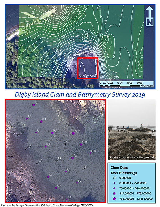 Once all the data were collected, the Geography 204 students collated and analyzed the data using ArcGIS software and produced the following maps illustrating the clam biomass of the area, as well as the contour information of the near-shore area.